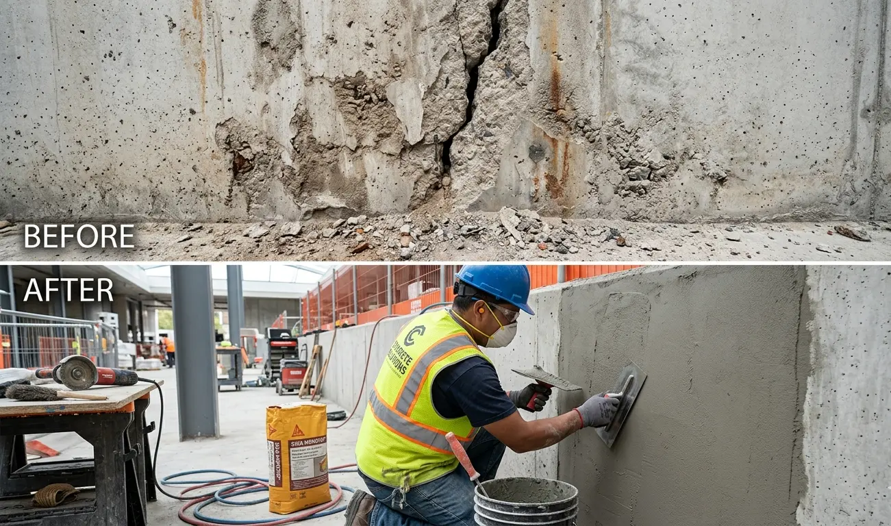Analyse complète de l’état du béton pour identifier les fissures et les zones endommagées. - Préparation de la surface
